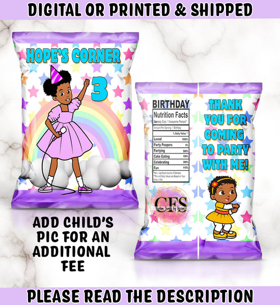 These Gracie's Corner custom chip bags can be filled with chips, cookies, popcorn, candy, toys, and more! Filled option bags come customized with your child's information and a 1 oz bag of pre-packaged chips ready for display (assorted variety and/or based on availability)
