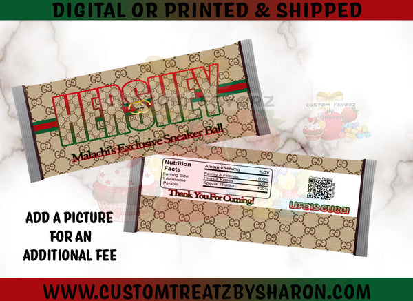 These custom Gucci Inspired Hershey candy wrappers will add that extra special touch to your party/event. The wrappers can be personalized with person(s) name and details. Please be sure to read the entire description before purchasing.