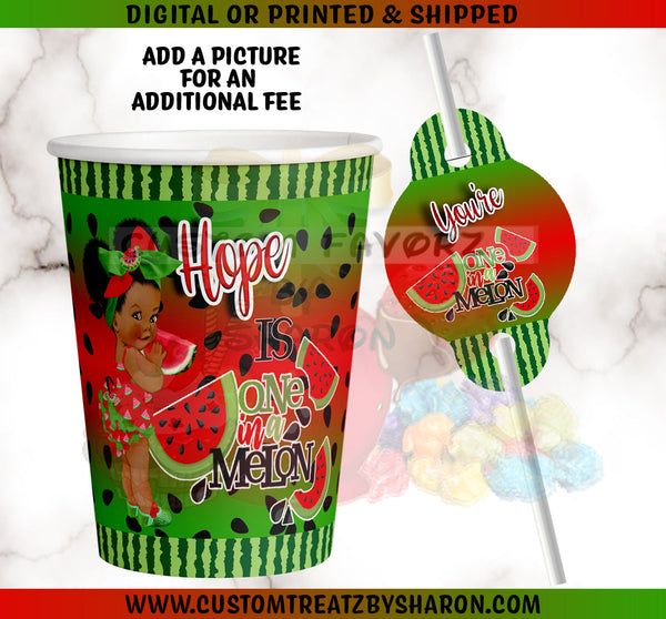 These One In A Melon custom cups and tags will add that extra special touch to your party/event. Cups and tags can be personalized with person(s) name and details. Please be sure to read the entire description before purchasing.