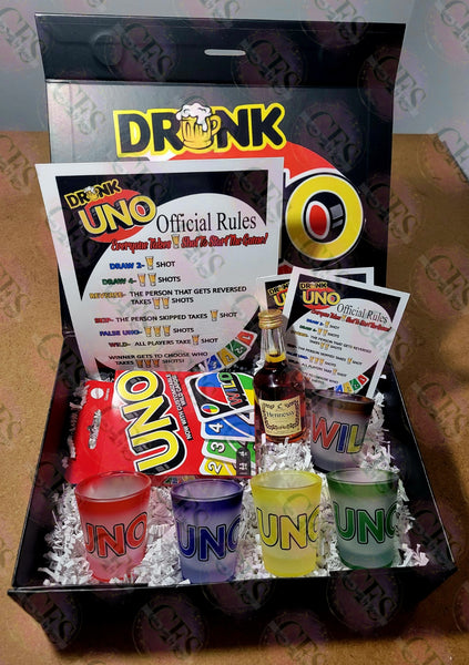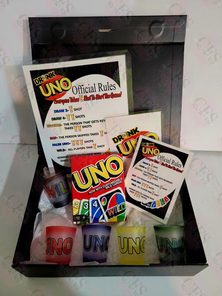 -4 shot glasses w/ red, blue, yellow & green UNO labels Extra glasses available for purchase ("WILD" available when a combination of extra glasses are ordered or by request only)