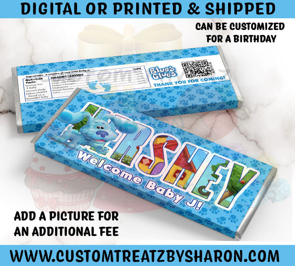 These custom Blue's Clues Baby Shower Hershey candy wrappers will add that extra special touch to your party/event. The wrappers can be personalized with person(s) name and details and are designed to fit the 1.55 oz full size hershey bar.
