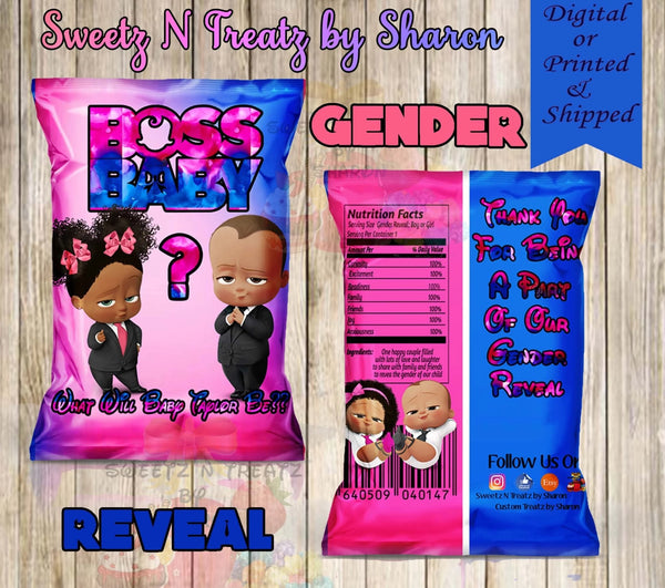 These Boss Baby Gender Reveal inspired chip bags can be filled with chips, cookies, popcorn, candy, toys, and more! Filled option bags come customized with your child's information and a 1 oz bag of pre-packaged chips ready for display (assorted variety and/or based on availability)