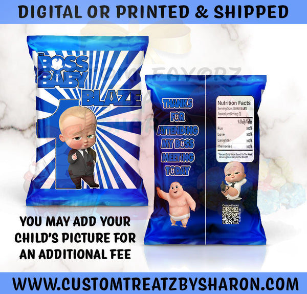 These Boss Baby inspired chip bags can be filled with chips, cookies, popcorn, candy, toys, and more! Filled option bags come customized with your child's information and a 1 oz bag of pre-packaged chips ready for display (assorted variety and/or based on availability)