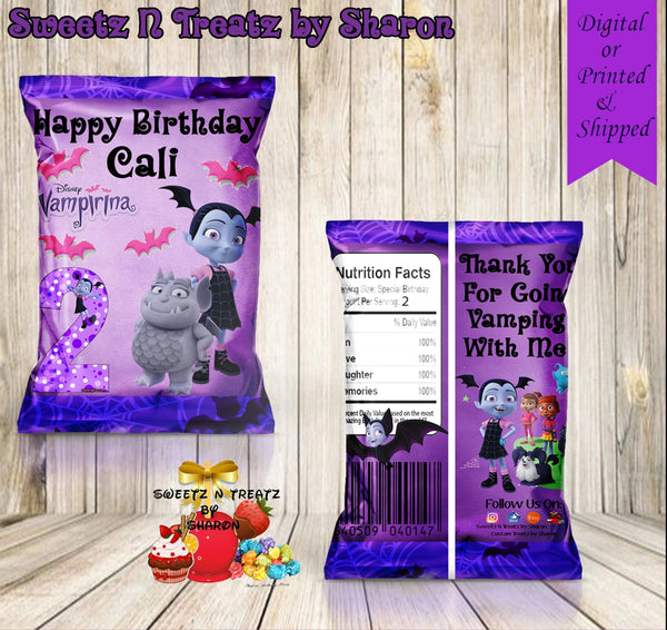 These Vampirina inspired chip bags can be filled with chips, cookies, popcorn, candy, toys, and more! Filled option bags come customized with your child's information and a 1 oz bag of pre-packaged chips ready for display (assorted variety and/or based on availability)